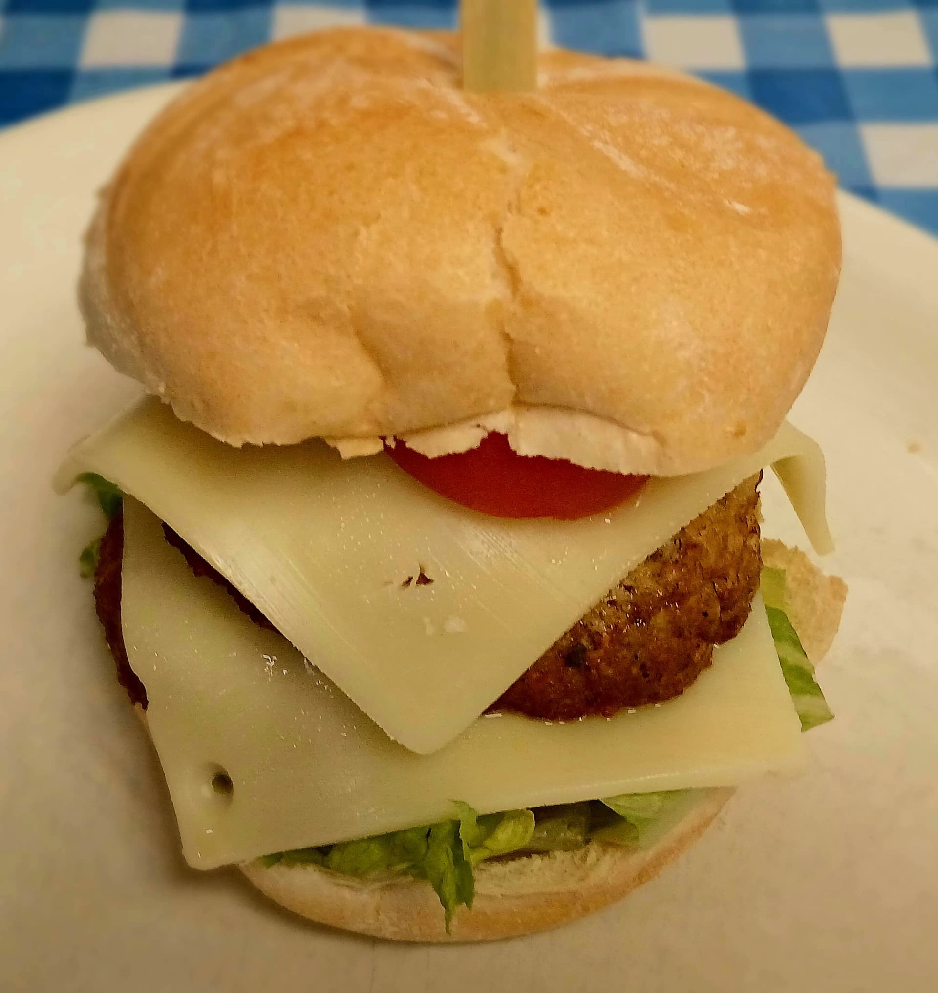 sliced Fleischküchla in Kaiser Roll w/lettuce, Swiss cheese, tomatoes & Bavarian Dressing
