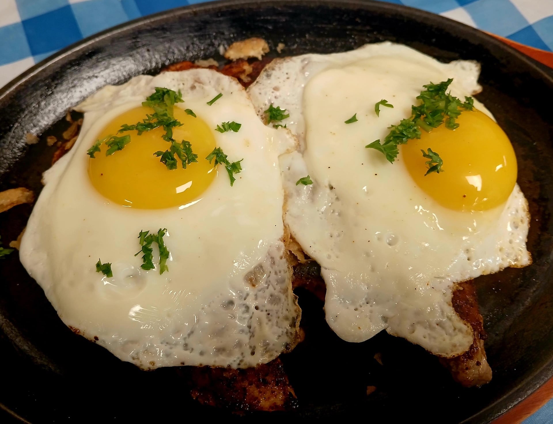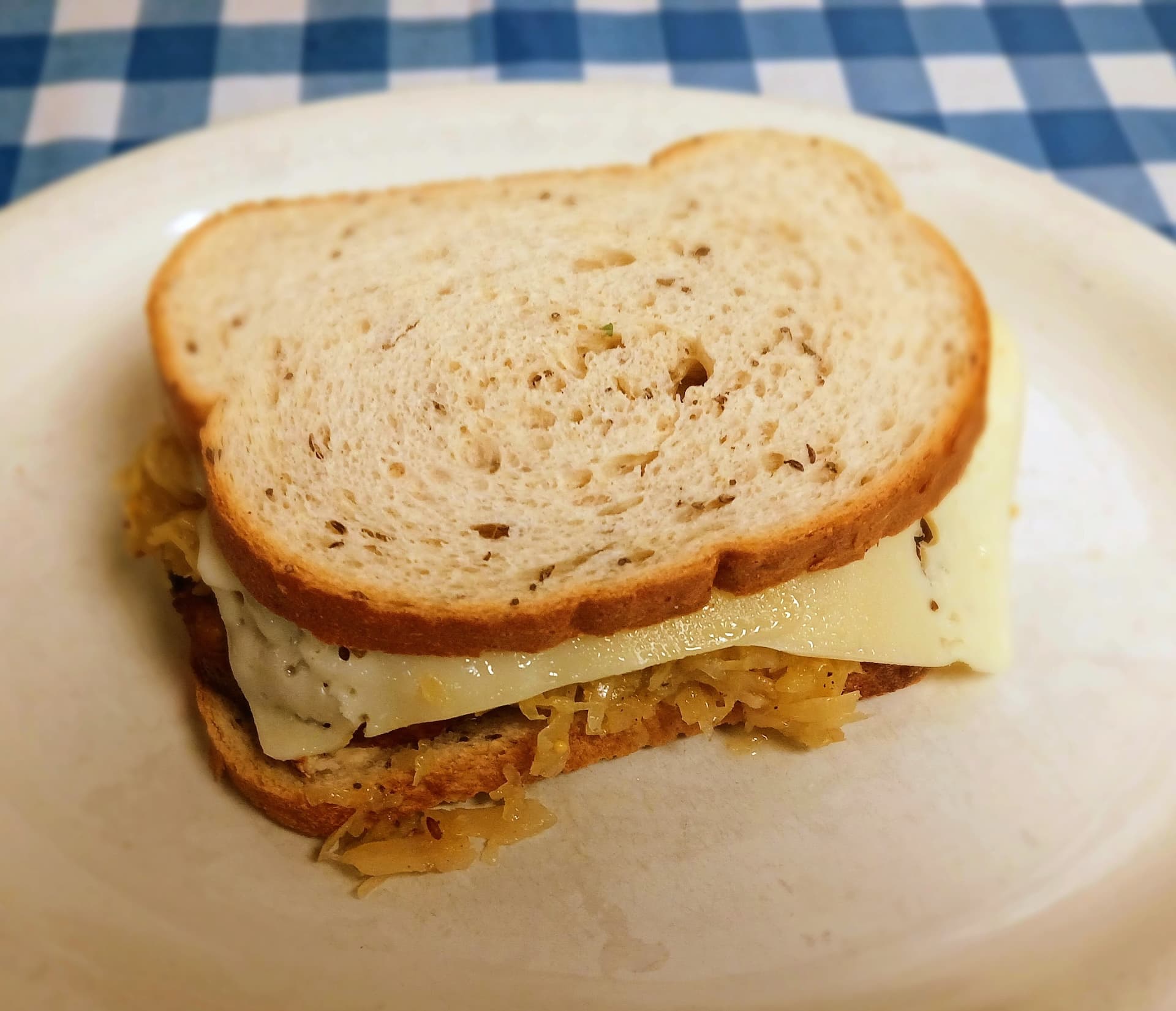 sliced Fleischküchla in Reuben Rye w/Sauerkraut, Swiss cheese & Bavarian Dressing (we recommend to eat with fork & knife)