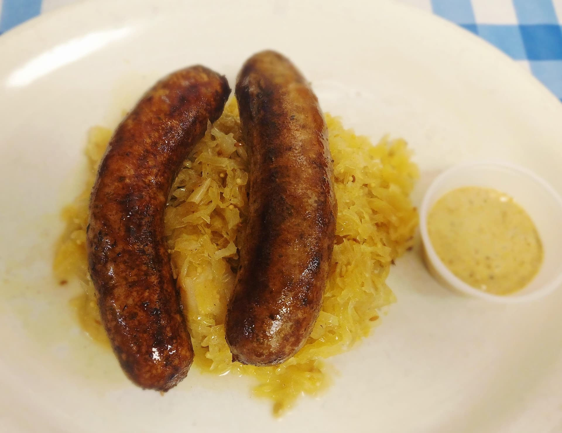 (Rainer's homemade Brats) served with house-recipe Sauerkraut & Brauhaus mustard