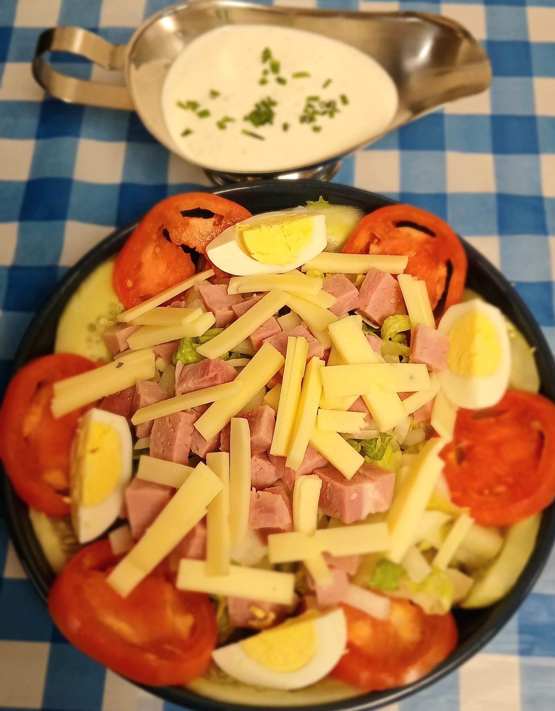 Lettuce, tomatoes, cucumbers, ham, Swiss, Egg, onions (add grilled pork or chicken for $5 extra) Boat of homemade Ranch always on side