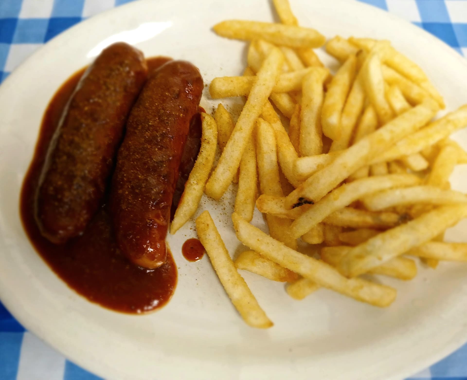 fried German Hot Dog & homemade Curry-Ketchup with French Fries or Kaiser Roll