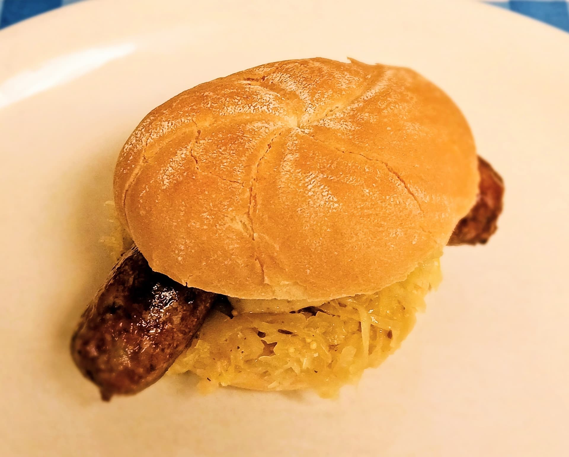 our own Bratwurst w/Sauerkraut & Brauhaus mustard in Kaiser Roll
