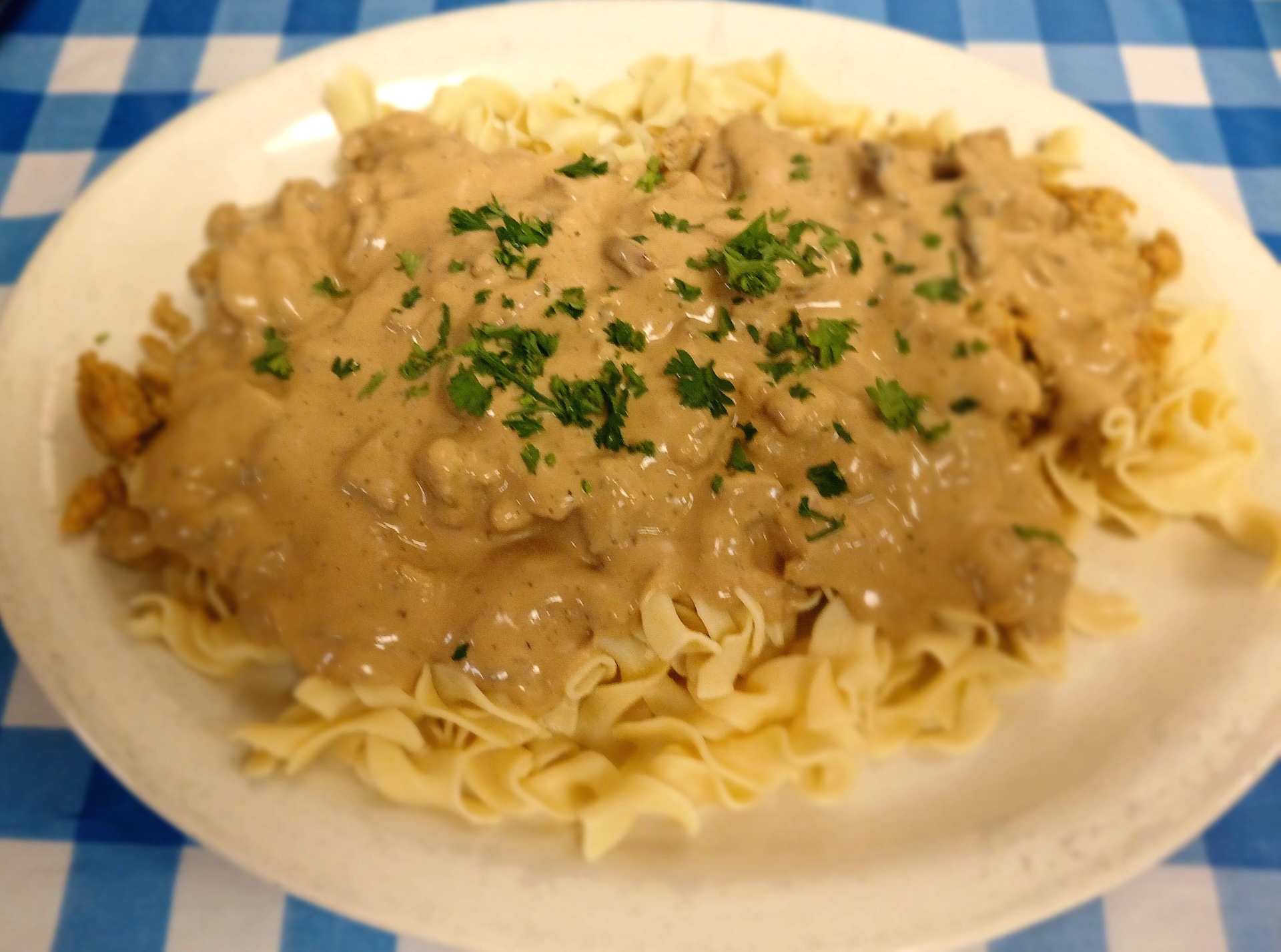 tasty seasoned ground pork with gravy of your choice served over wide ribbon noodles