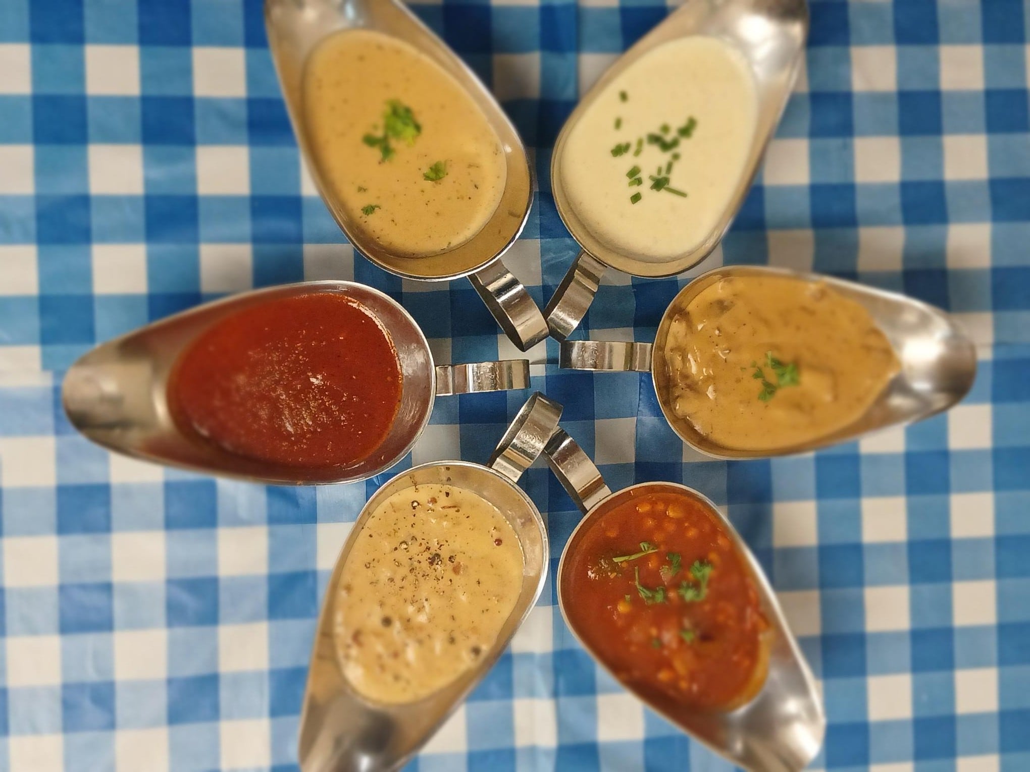 **gravies starting in the left center going clockwise: Curry Ketchup, Rahmsauce, Horseradish, Mushroom, Gypsy, Pfeffer-Rahmsauce**